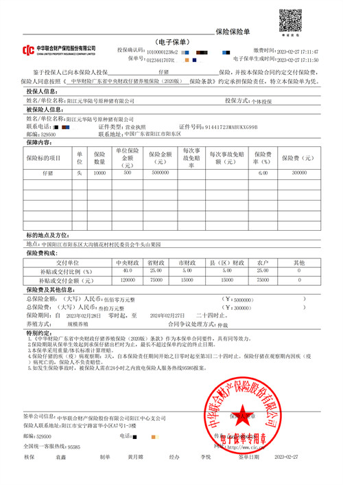 阳江元华陆号元种猪场的种母猪顺利产仔多胎并已为今年出生的10000头仔猪购买了国家中央财政补贴部分的仔猪保险!承保企业为当地政府指定的中华联合财产保险公司。该猪场的种母猪已经在当地畜牧局登记存档备案,并经保险公司核保人员现场核实。